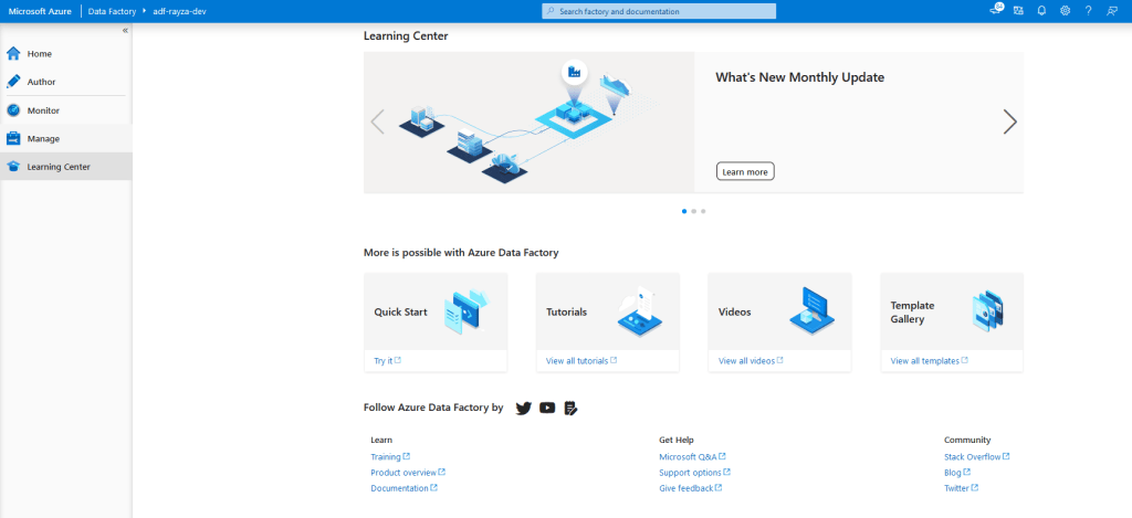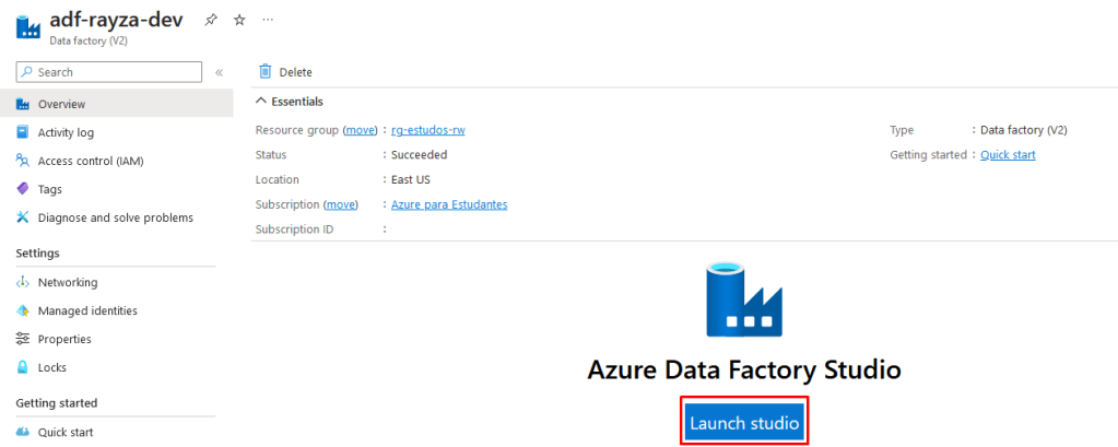 Com o Azure Data Factory já provisionado com sucesso, irá ser emitido uma notificação no portal onde basta ir no grupo de recursos escolhido, selecionar o ADF criado e clicar em “Launch studio” para abrir a interface do estúdio. Mas caso queira acessar diretamente pelo navegador, basta digitar o endereço https://adf.azure.com/ e selecionar qual o Azure Data Factory você quer abrir.