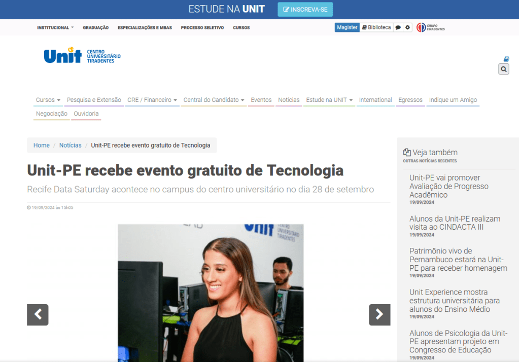 Além de nossas divulgações padrões pelos nossos LinkedIns e Instagrams, também tivemos a divulgação do evento no blog de notícias da UNIT e na sessão de eventos do site do Conecta Recife, que é um dos principais portais criados pela Prefeitura do Recife, acessado diariamente por milhares de pessoas para diferente fins.